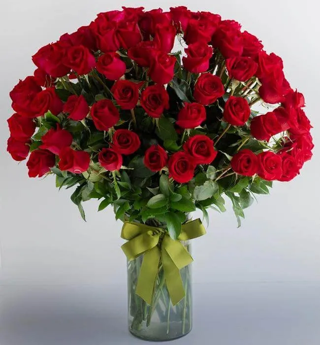 Hermoso florero de cristal de 100 rosas rojas para San Valentín