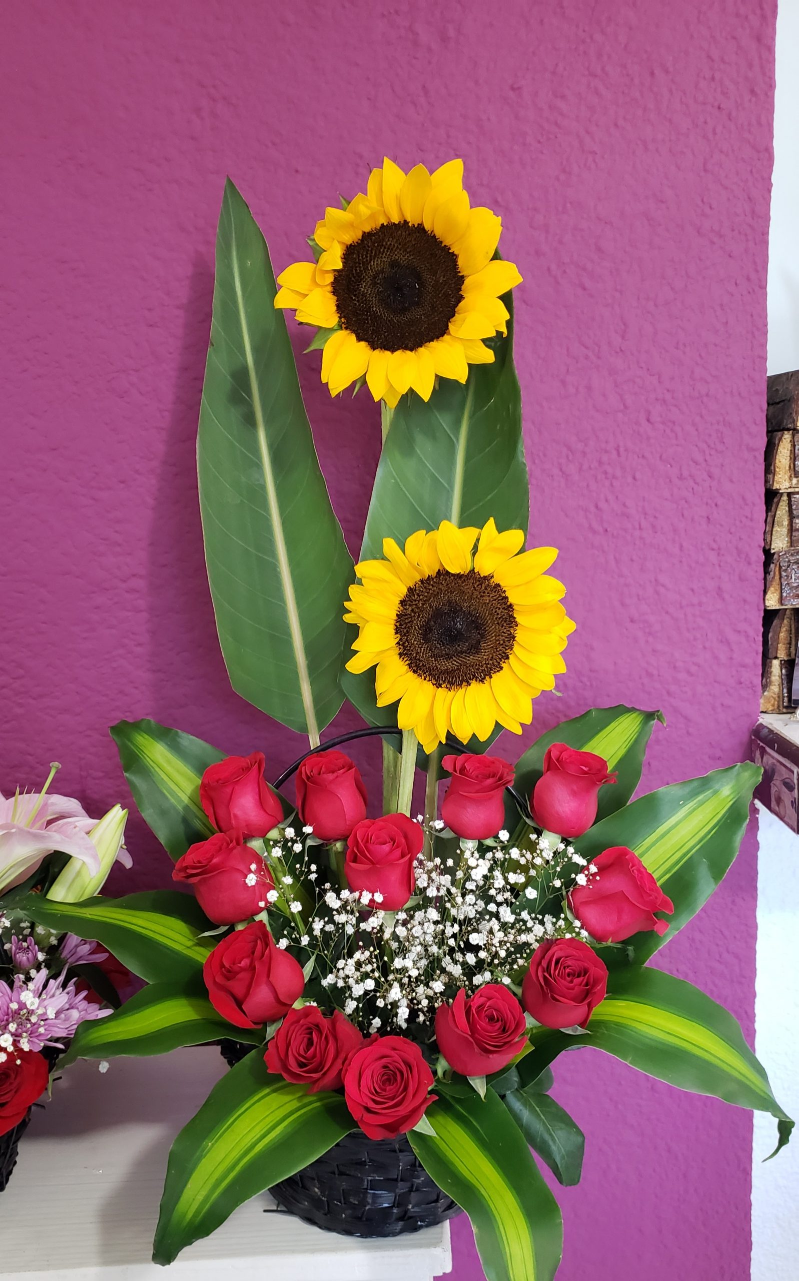 Inovador diseño de corazón de 12 rosas mas 2 girasoles, exclusivo para regalar este día de San Valentín